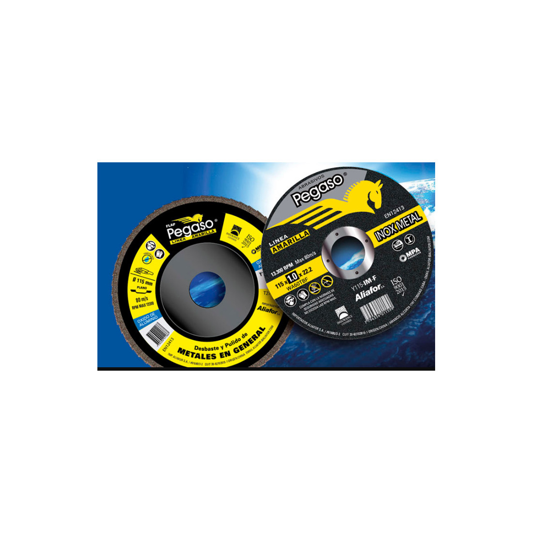 Aliafor S.A ofrece al mercado dos modelos de discos destinados al corte y Desbaste “Pegaso metal ” y ” Pegaso Inox – metal” y un tercer modelo de prestación superlativa destinados al corte de metales “Pegaso – Extra” . Por último, para el corte y desbaste de materiales de la construcción “Pegaso – Piedra”. La nueva Línea Amarilla de Pegaso Abrasivos demuestra que brindar Excelente Performance a un Precio Increíble es posible… Pegaso Línea Amarilla es el complemento ideal de Pegaso Abrasivos para el que busca ofrecer, en los modelos de mayor rotación, una alternativa de precio muy conveniente.